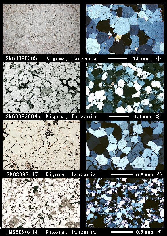 ここでは,Kigoma の Bukoban 系の砂岩を例にした。このような砂岩はアフリカ以外にも 存在する。アフリカ以外の安定大陸で形成される砂岩の例,また,日本列島以外の変動帯の砂岩の例を 項をあらためて,述べることにする。