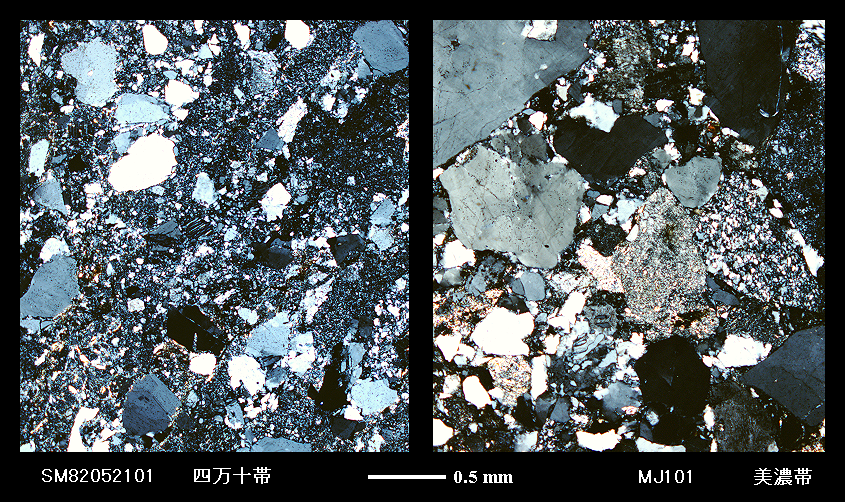 ◇日本列島の砂岩:比較のために,日本列島の中で,いわゆる melange terrane を構成する白亜紀の四万十帯の砂岩,および,同じくジュラ紀の美濃帯の砂岩を 下に示す。