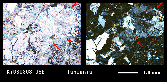 この図からわかるように,いくつかの捕獲岩片や捕獲鉱物を含んでいる。この図では,とくに 目立つ部分を赤い矢印で示したが,それらの捕獲岩片や捕獲鉱物のほとんどはその周辺部が異質な部分に 変っている。これは捕獲された岩石が熱のために,その外側が変質したためであろう。