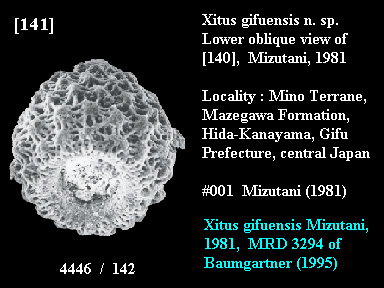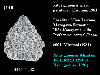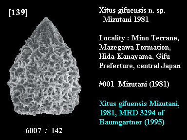 Described as a new species by #001 Mizutani (1981) from siliceous tuffaceous shale at Hida-Kanayama, Mino Terrane, central Japan.